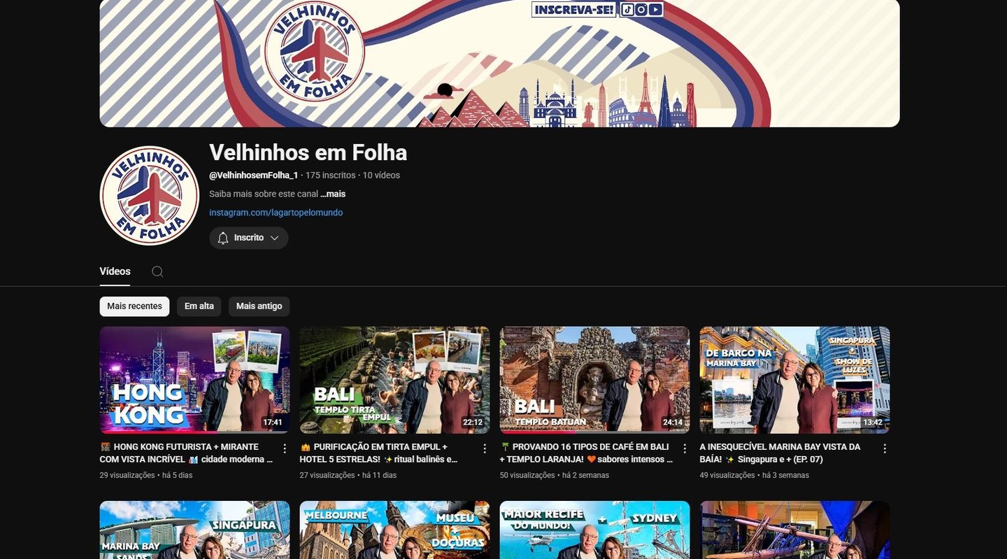 O Velhinhos em Folha é um canal de viagens no YouTube que acompanha um casal explorando o mundo. O conteúdo é voltado para mostrar experiências autênticas, destinos interessantes e a perspectiva de viajantes mais experientes.